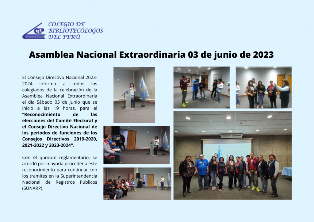 Asamblea Nacional Extraordinaria 03 de junio de 2023 by Colegio de Bibliotecólogos del Perú | Jun 5, 2023 | Eventos | 0 comments