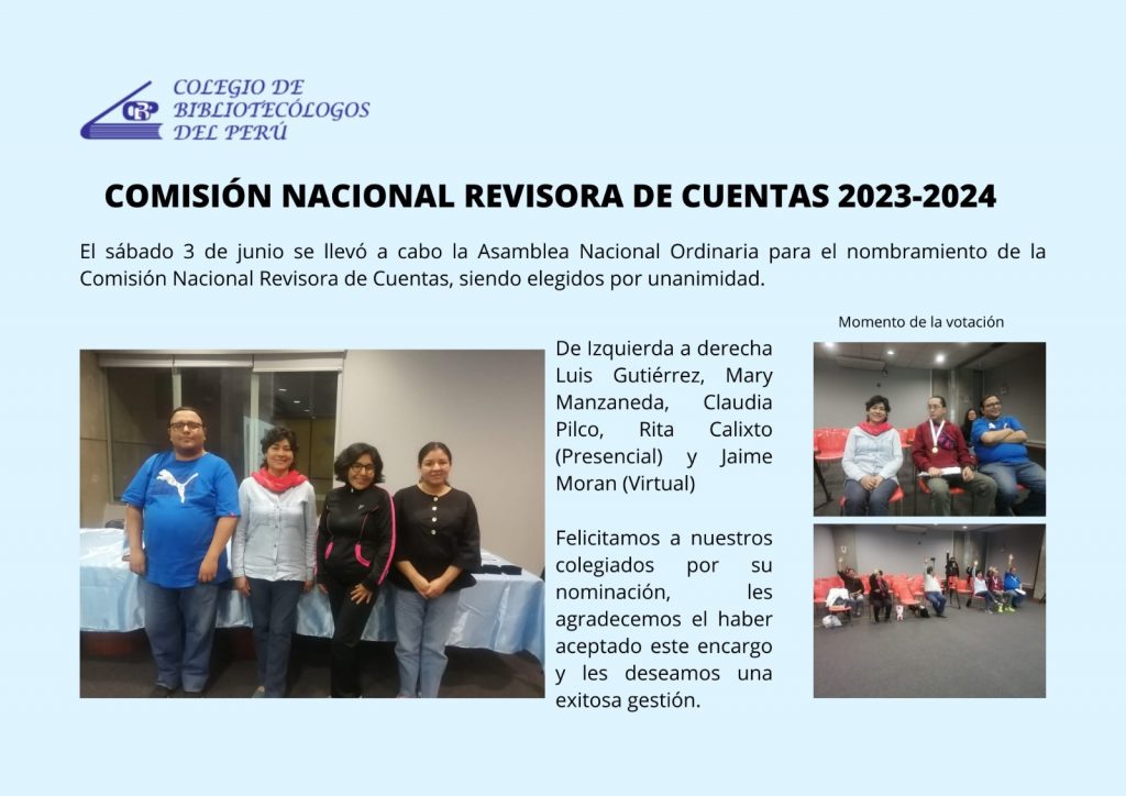 Comisión Nacional Revisora de Cuentas 2023-2024 by Colegio de Bibliotecólogos del Perú | Jun 5, 2023 | Eventos | 0 comments