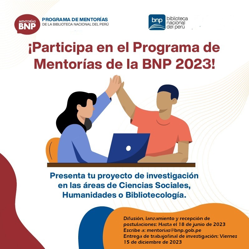 Programa de Mentorías de la BNP 2023 by Colegio de Bibliotecólogos del Perú | Jun 17, 2023 | Eventos | 0 comments El Colegio de Bibliotecólogos del Perú cumple con difundir la siguiente información sobre el Programa de Mentorías de la Biblioteca Nacional del Perú para el año 2023. Las Bases del programa en mención pueden consultarse en el siguiente enlace: https://tinyurl.com/yckusp6p Los Anexos sobre las Mentorías pueden consultarse en el siguiente enlace: https://tinyurl.com/27ejm5f8